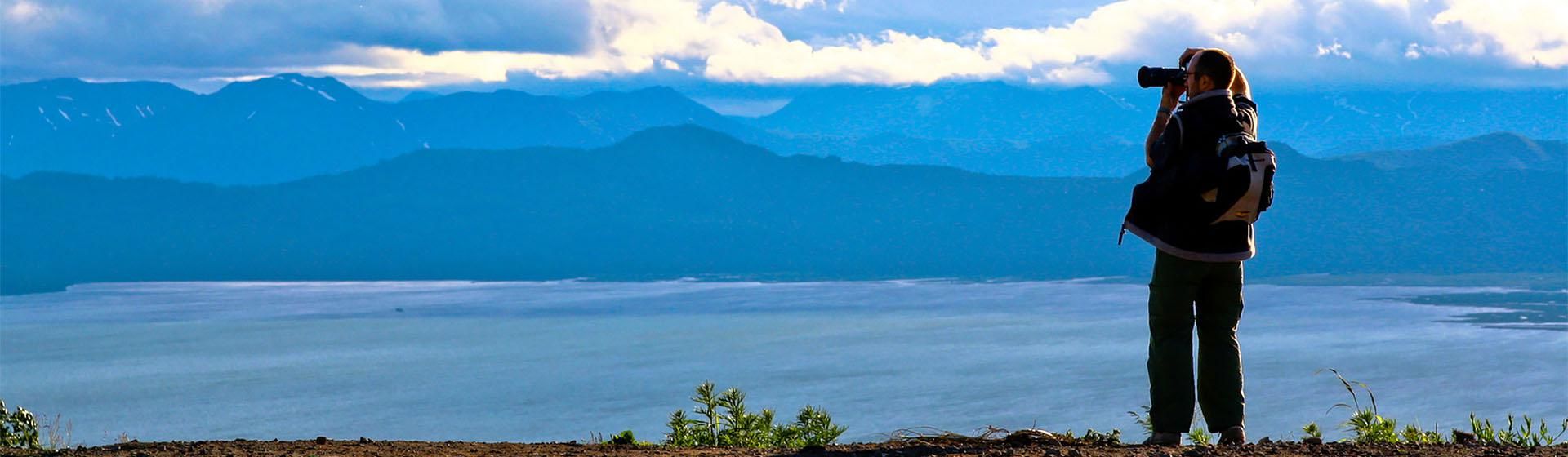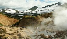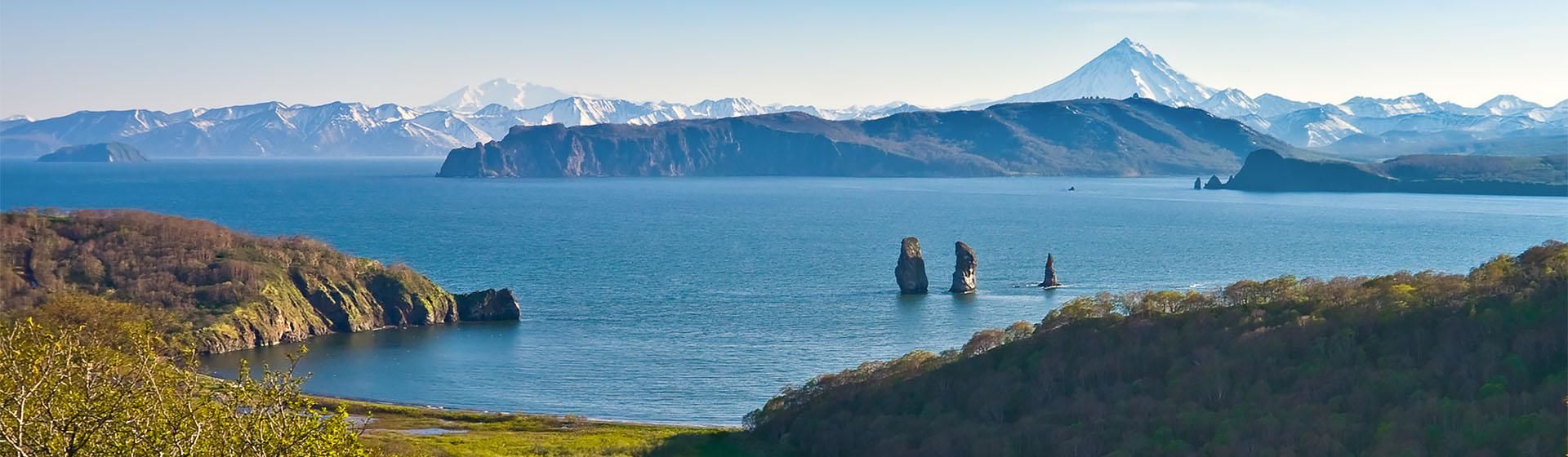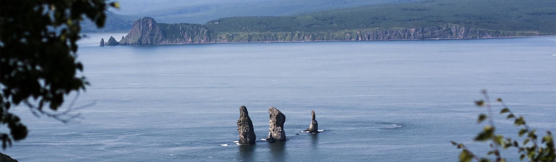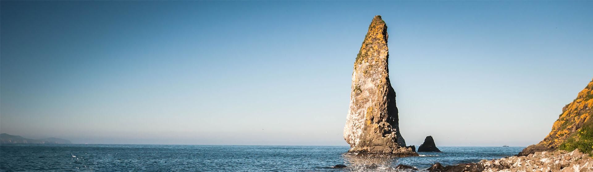 We drive by several bays, the most interesting is Big Lagernaya. It is surrounded by rocks inhabited by sea birds, Devil’s Thumb rock towers in the distance, and there are remains of an abandoned settlement on the shore.